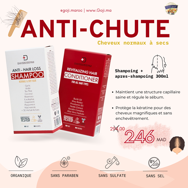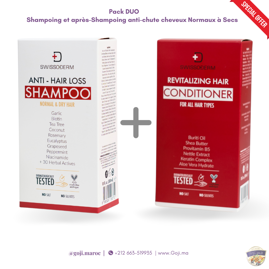 Prenez soin de vos cheveux avec le Pack DUO SWISSODERM, une combinaison parfaite pour lutter contre la chute des cheveux tout en apportant hydratation et vitalité. Conçu pour les cheveux normaux à secs, ce duo offre un soin complet pour renforcer et revitaliser vos cheveux.